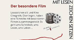 In Zusammenarbeit mit dem Kino Cinegreth in Überlingen entstehen besondere kulturelle Angebote, die Literatur, Film und Gemeinschaft verbinden. Im Rahmen des Jubiläumsprogramms „MIT LESEN ZEICHEN SETZEN – 20 Jahre Lesezeichen e. V.“ zeigt Lesezeichen gemeinsam mit dem Kino Cinegreth besondere Filme, die zum Nachdenken anregen, Geschichten erzählen und in Gespräch bringen.